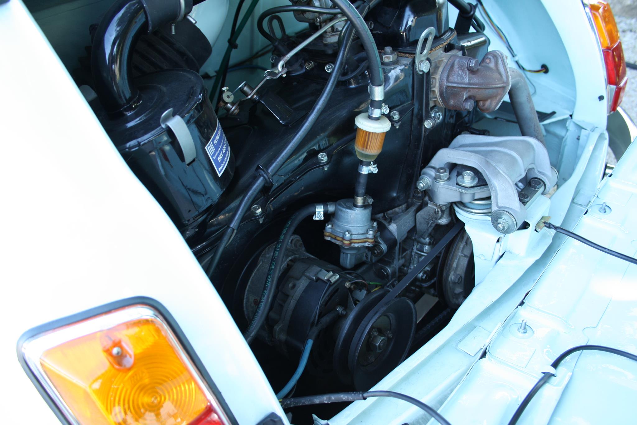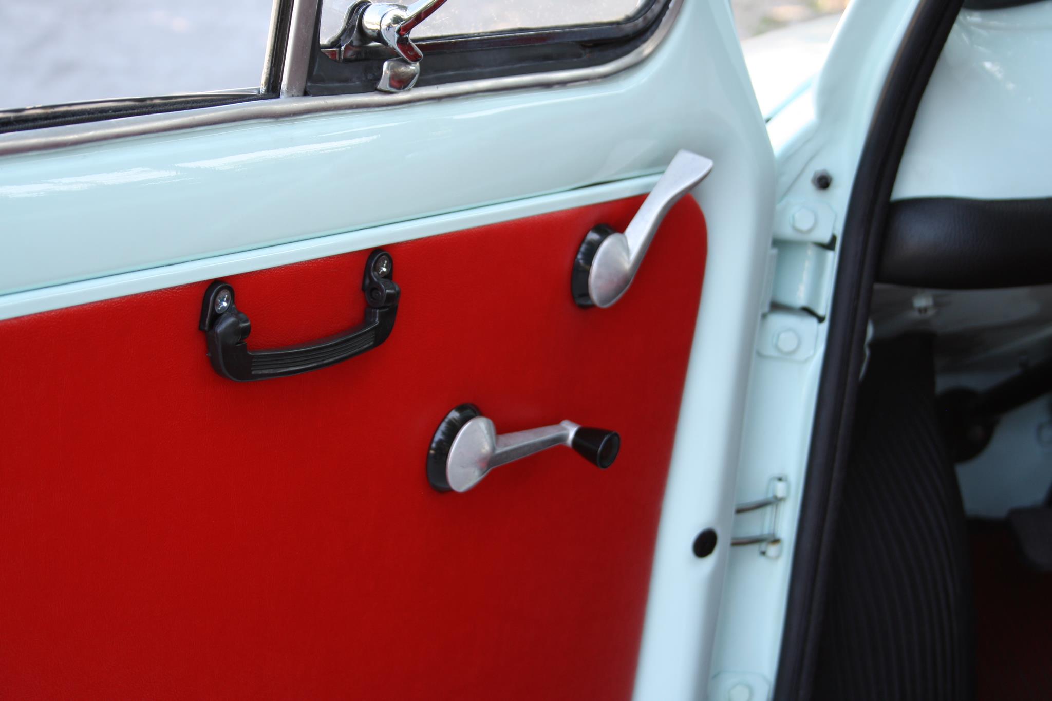 Cet exemple est fini en bleu clair sur une cabine garnie de vinyle rouge avec des dessus de siège blancs et un passepoil blanc. Il roule sur un jeu de roues de 12 pouces avec des enjoliveurs chromés. La spécification comprend un toit rabattable en vinyle noir, un volant à deux branches et des fenêtres custodes avant ouvrantes.