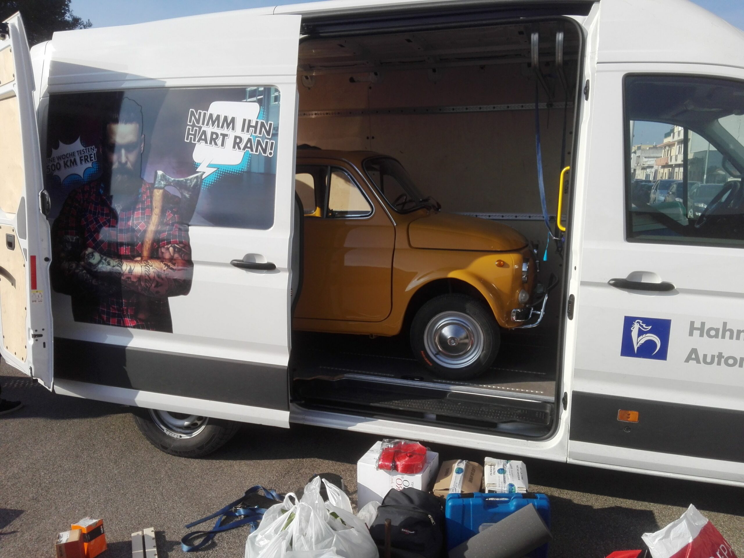So I got him in the car and drove him to the emergency room. We stayed there for a couple of hours then, after putting stitches on them, we loaded the Fiat 500 into the van and it set off immediately.