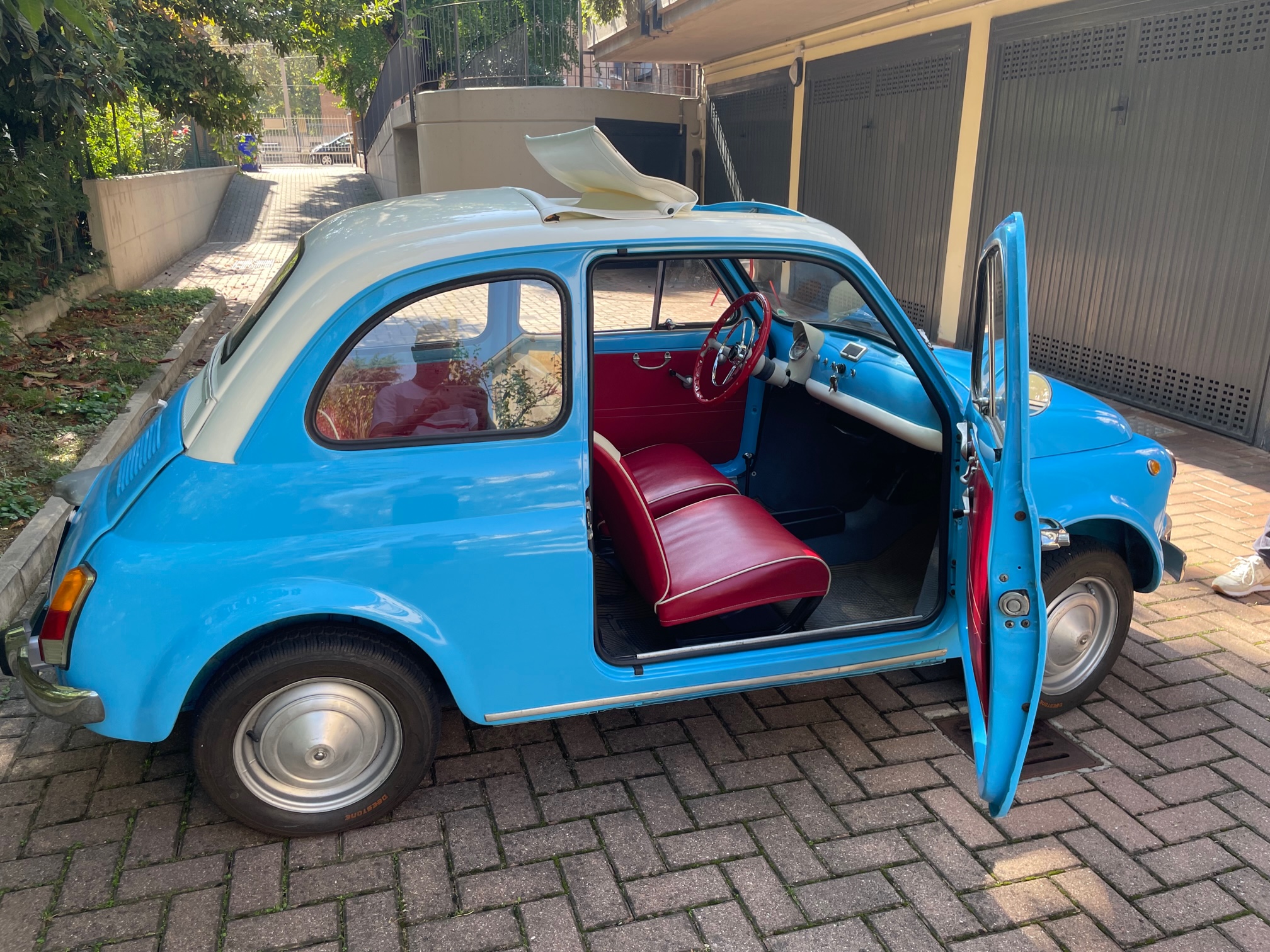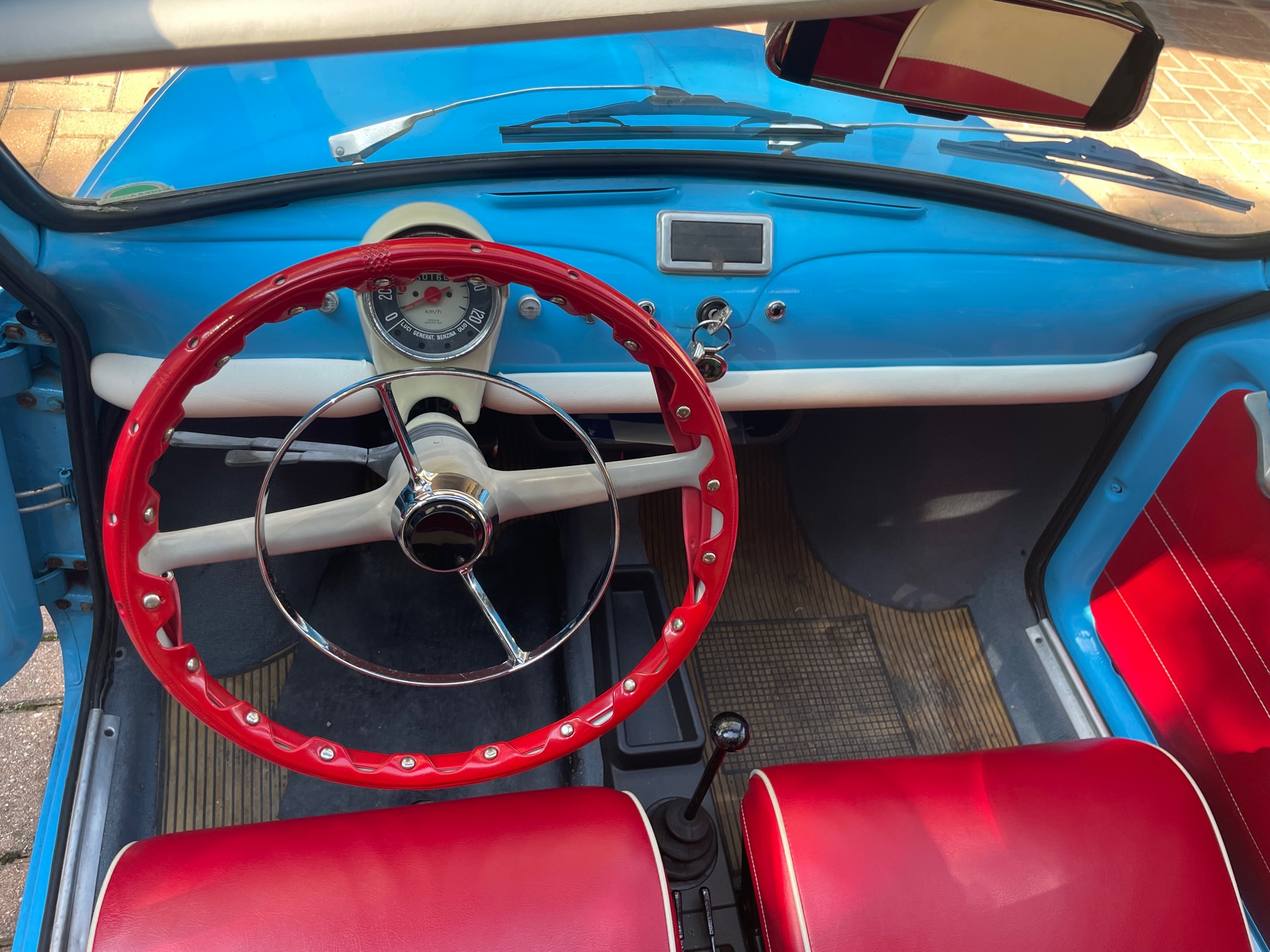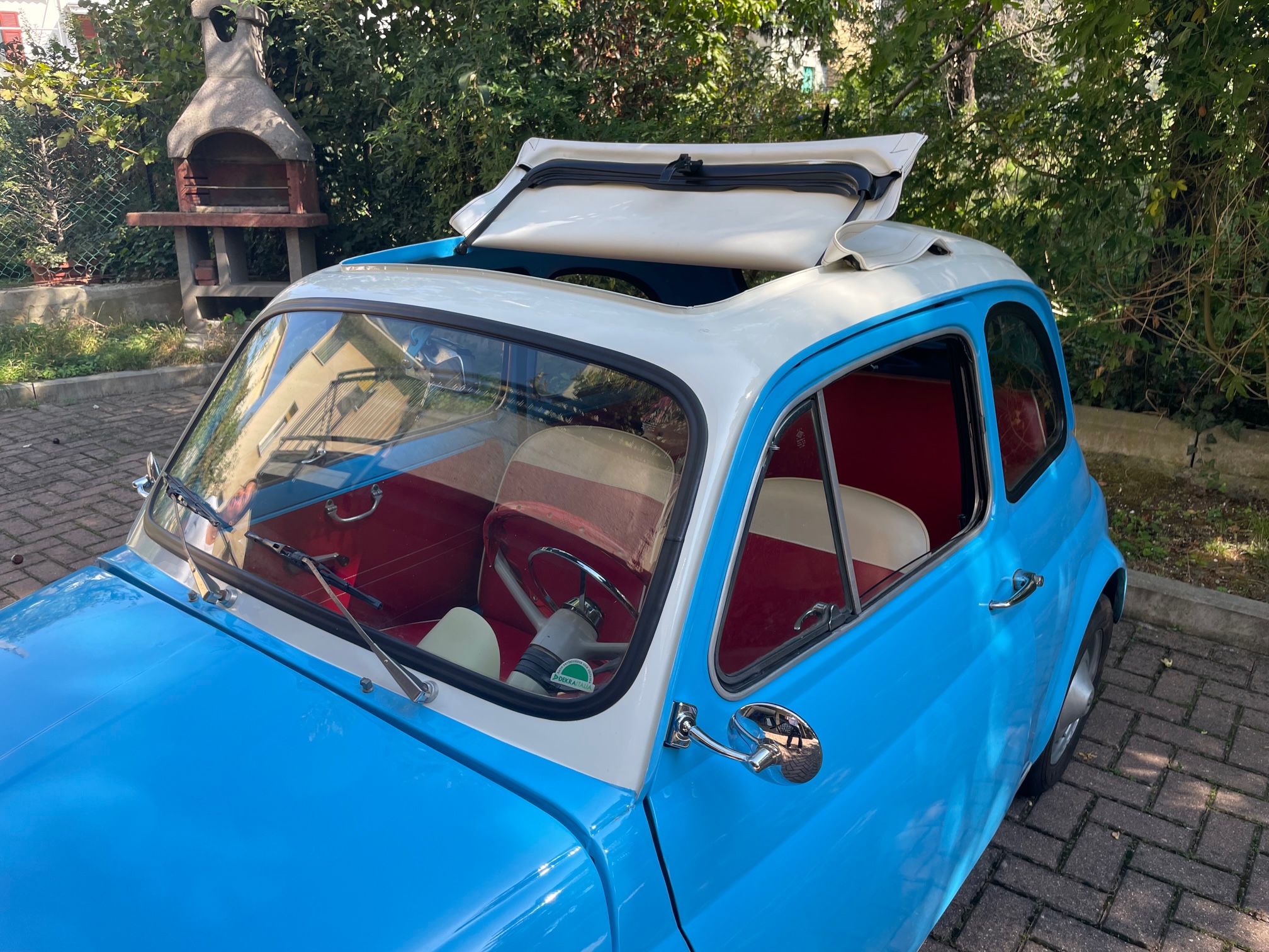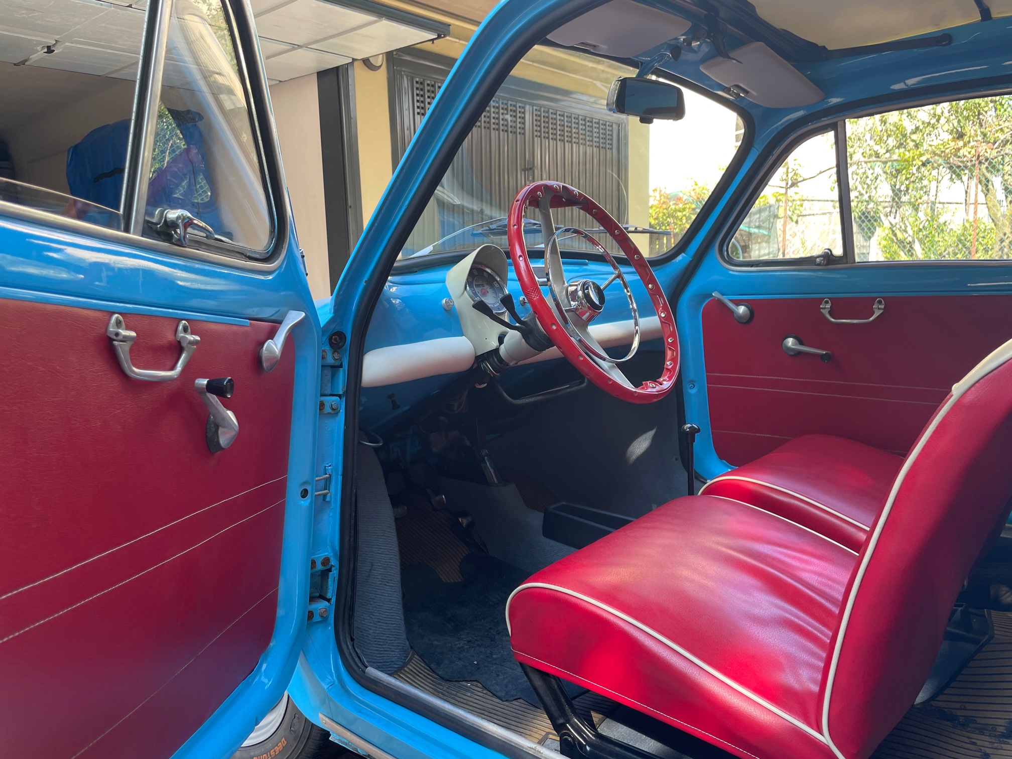 Whilst on vacation in Otranto (Puglia), he and his wife saw a great little Fiat 500 parked on the road near the sea. Each day the car was always parked in the same location so on this day they decided to go into the local farm next to the car and inquire about the Fiat 500 parked outside. The house owner knew nothing about the Fiat parked on the street, but instead he took them to a small garage located on the back of property which clearly hadn’t been opened in years! Inside the garage was a large crate and upon opening the crate was me, a lovely blue and white Fiat 500!