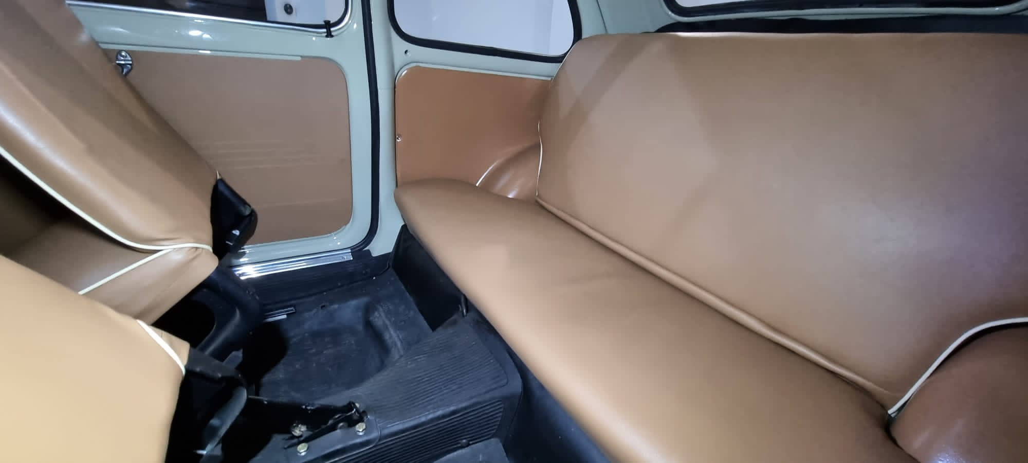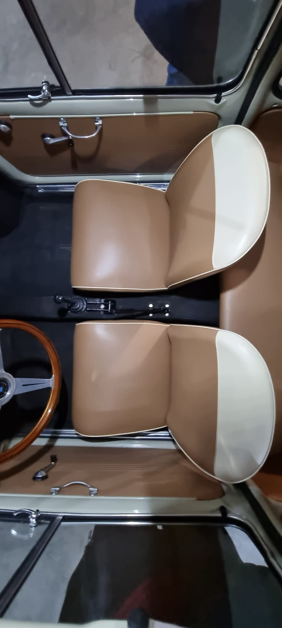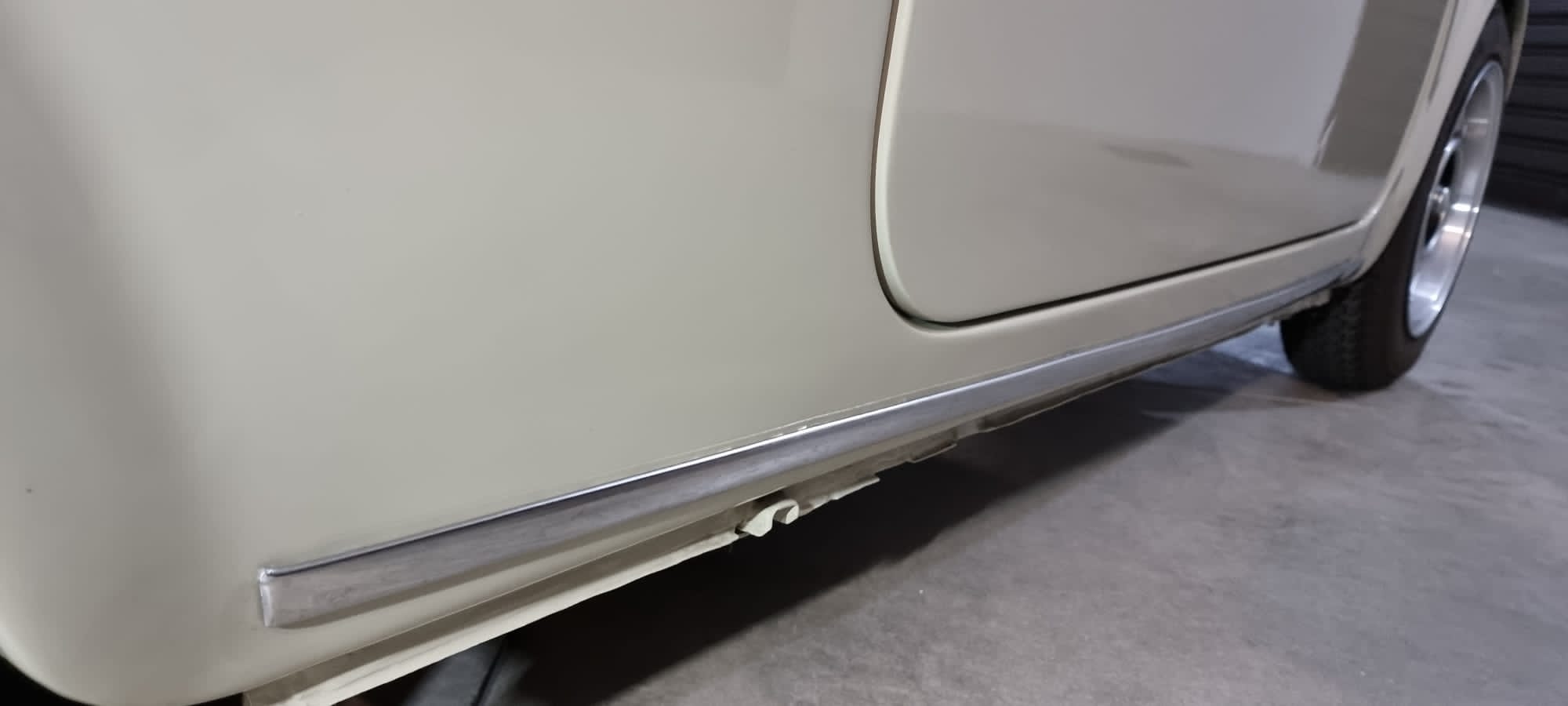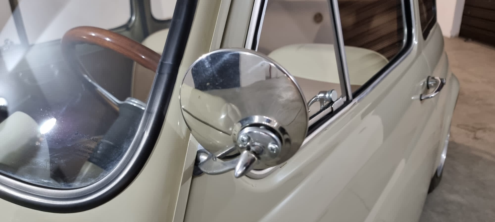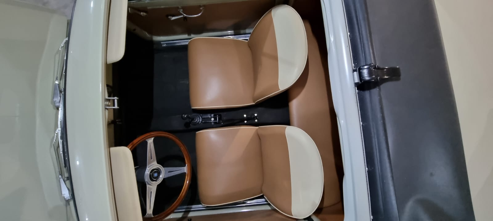 The interior has been redone by sandblasting the frames, repainting them with powder and using colors and features designed to reproduce the original colours, while the bodywork has been brought to sheet metal without sandblasting it, replacing the bottoms of the rear sides and the front quarter.