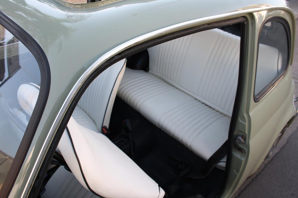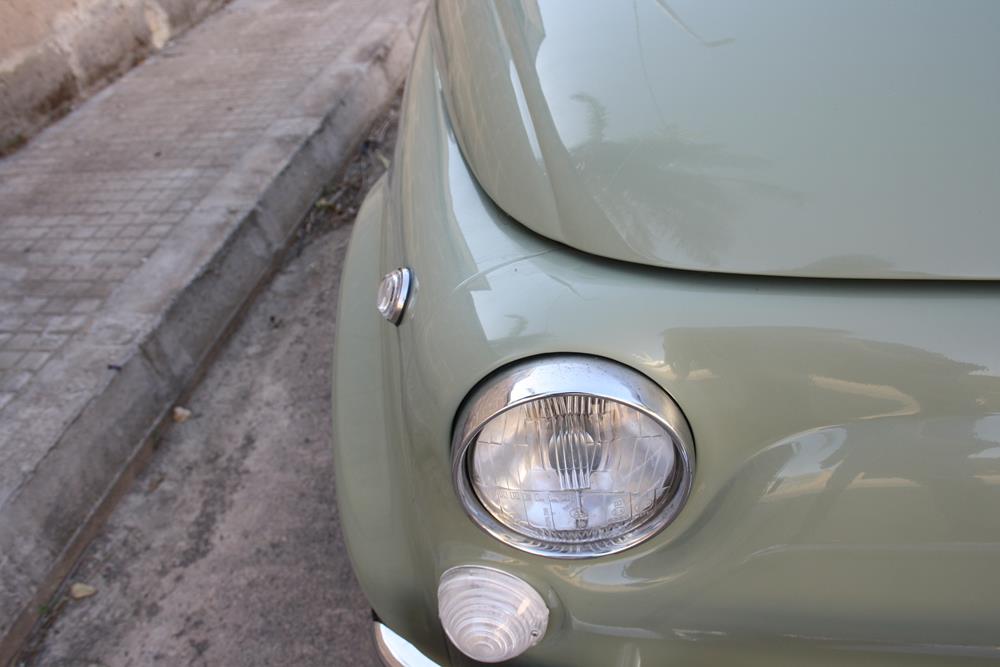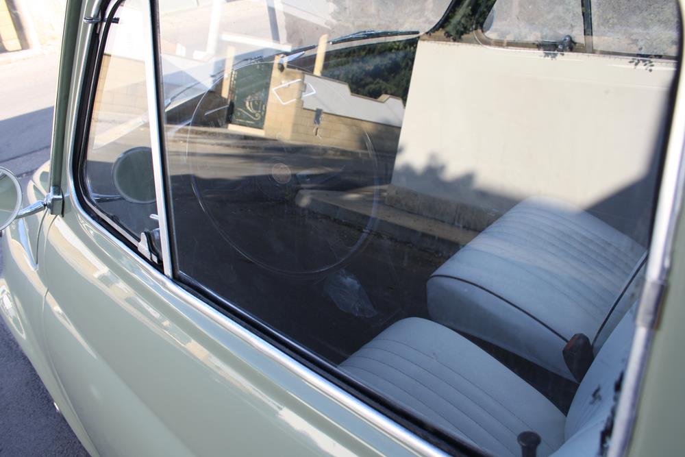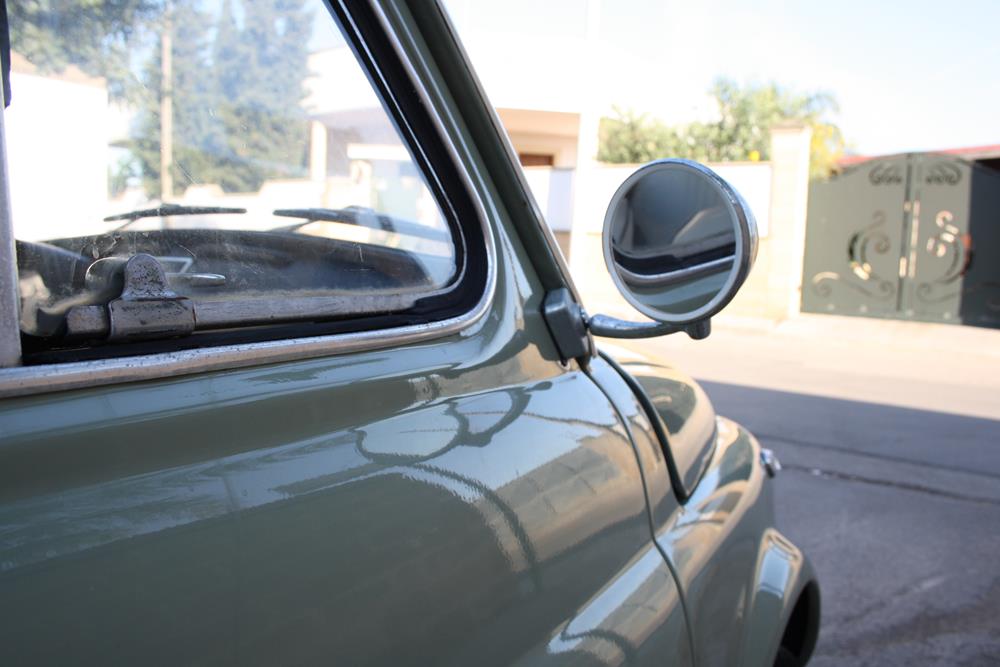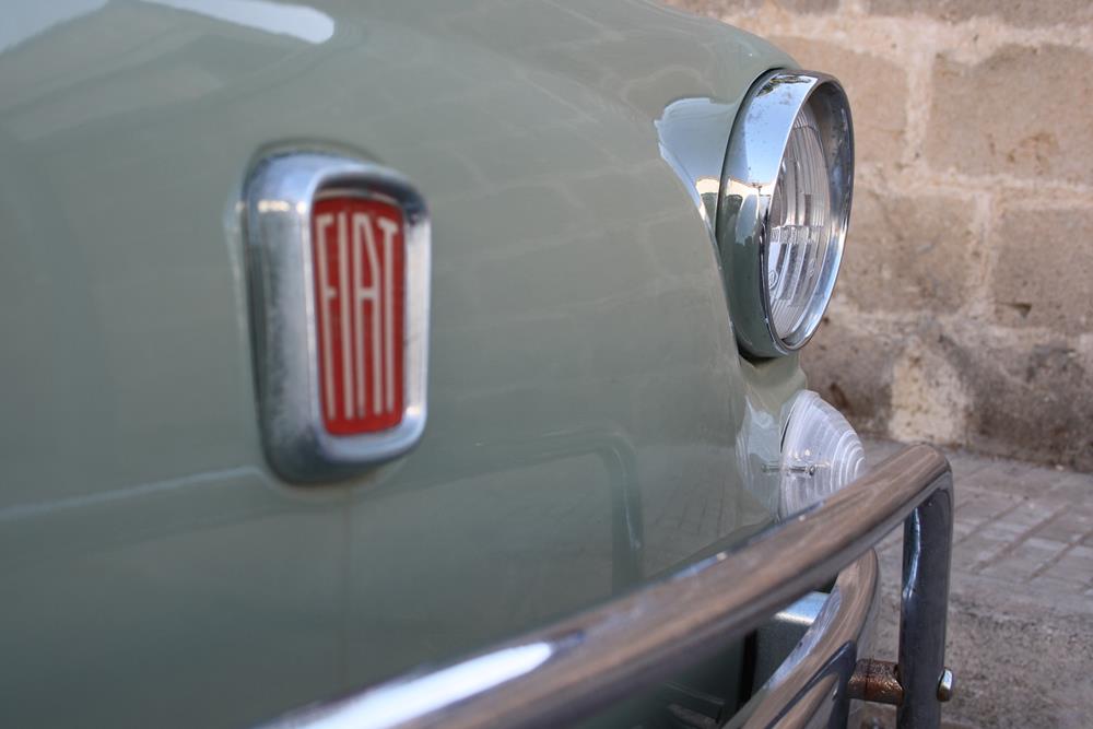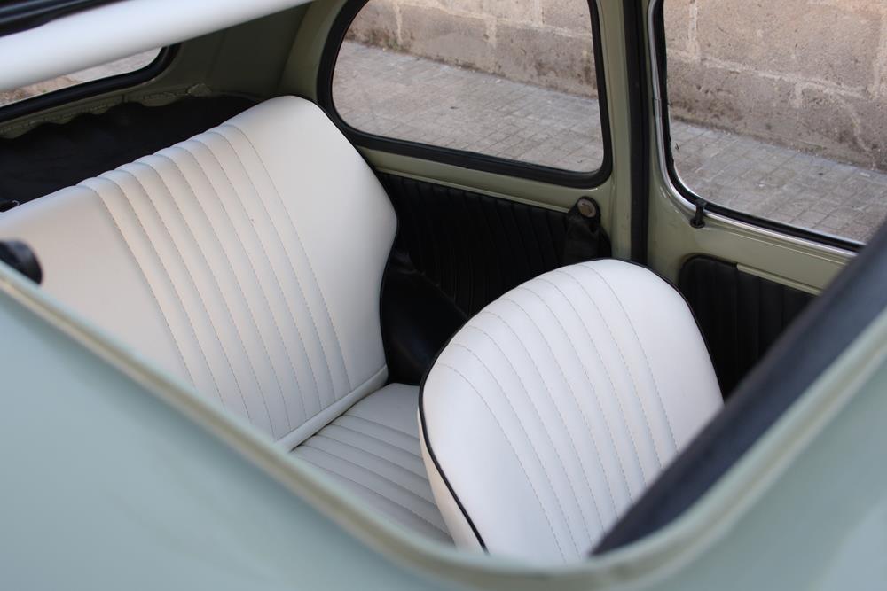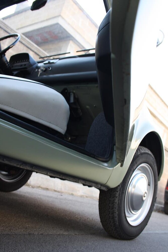 Initially the Fiat 500 was in “Giallo Positano” color with a black interior, but during the restoration the color was changed to this “Verde Aquamarina”. The combination of colors between interior and body is also very apt.
