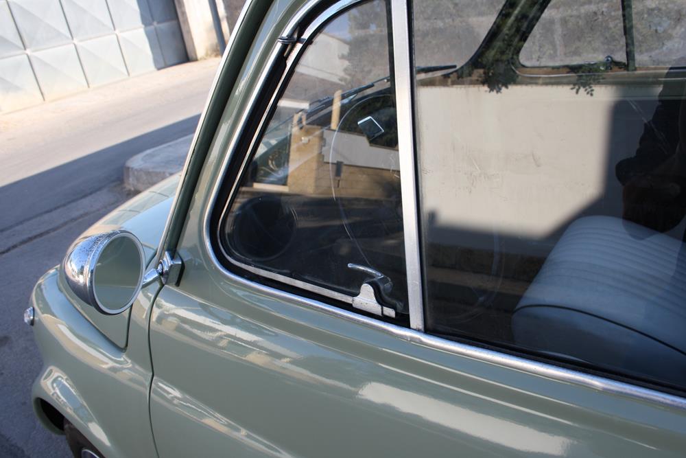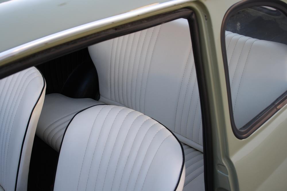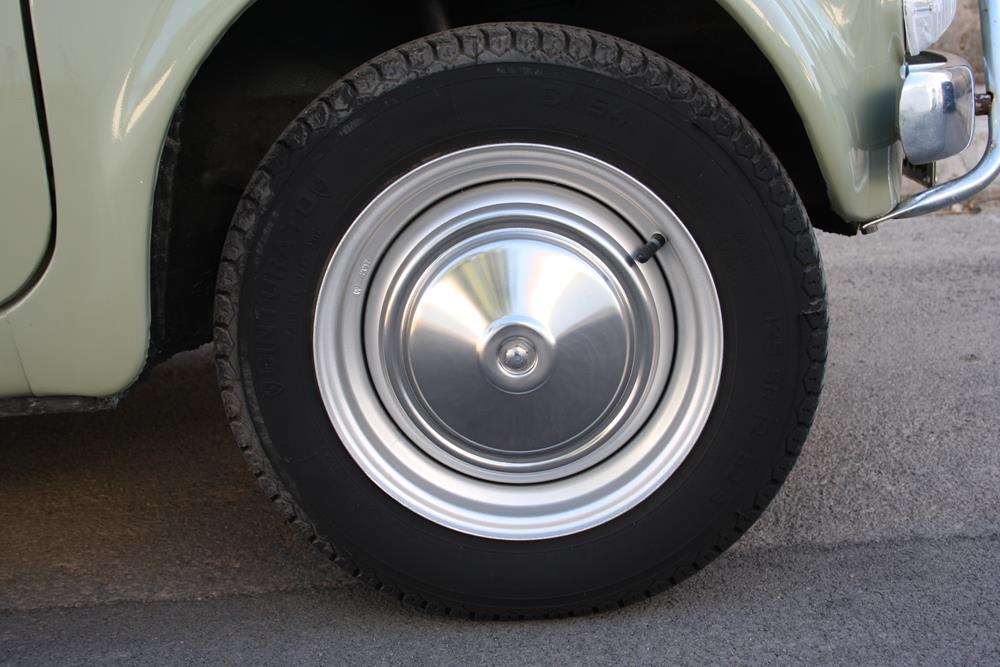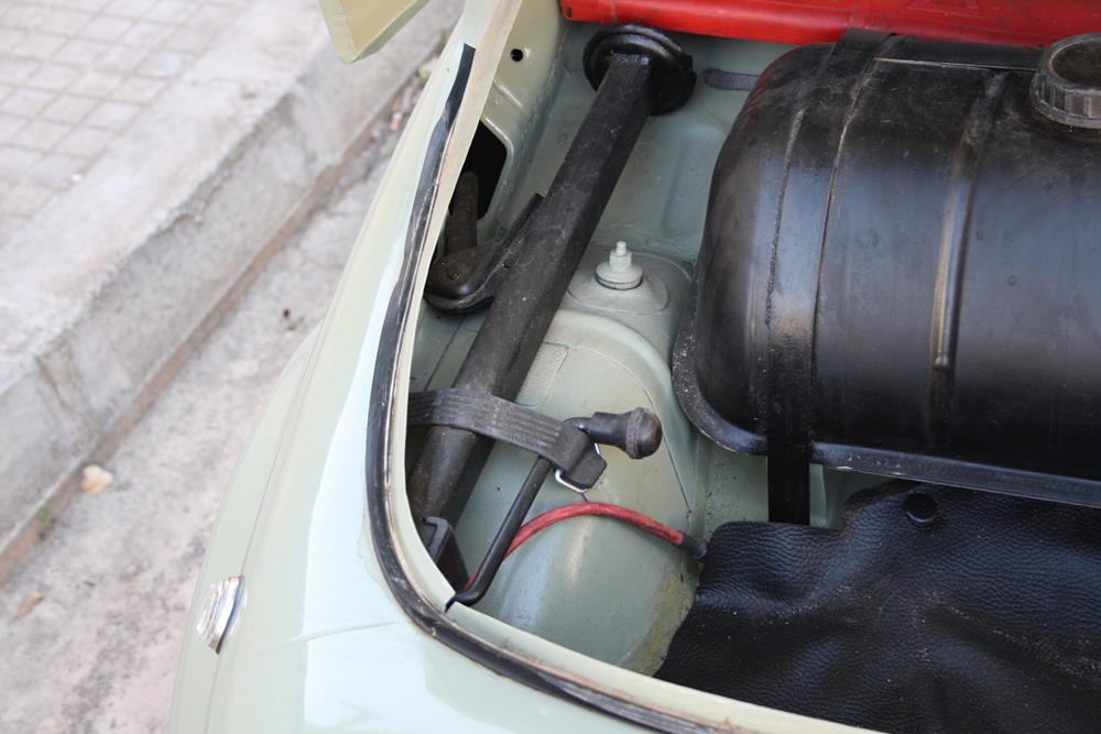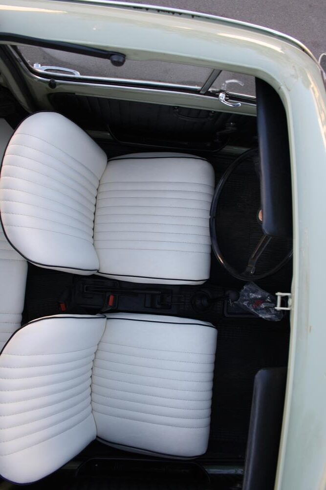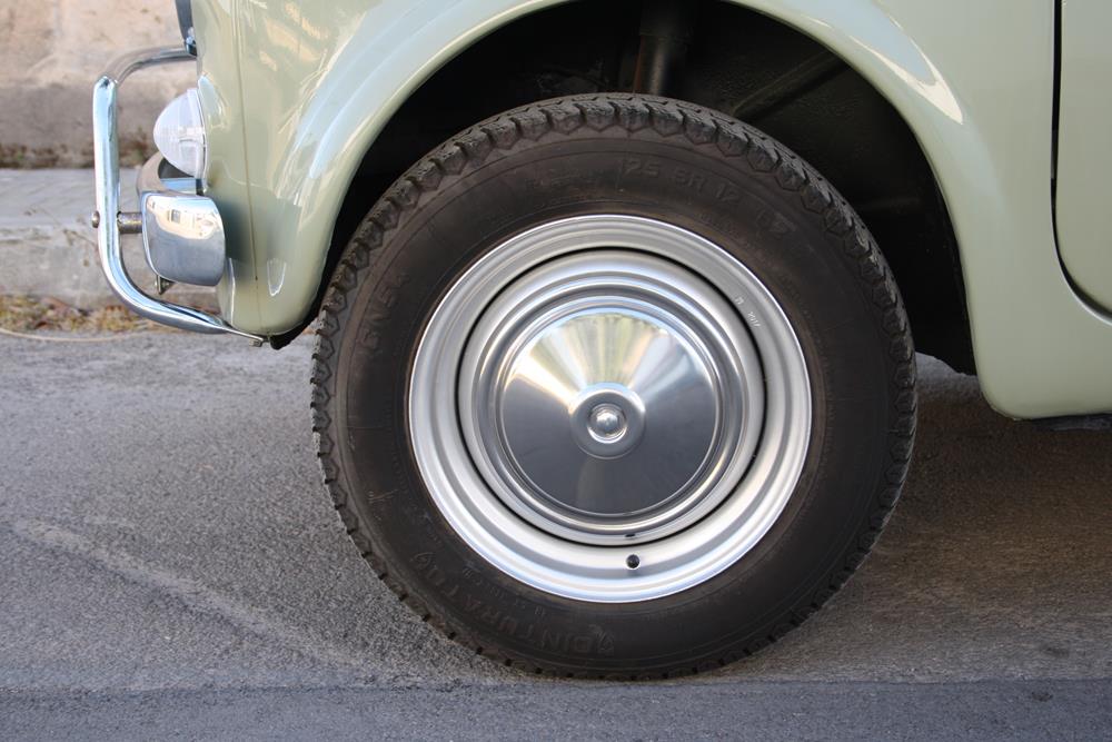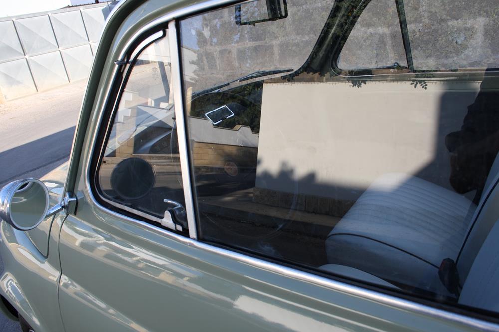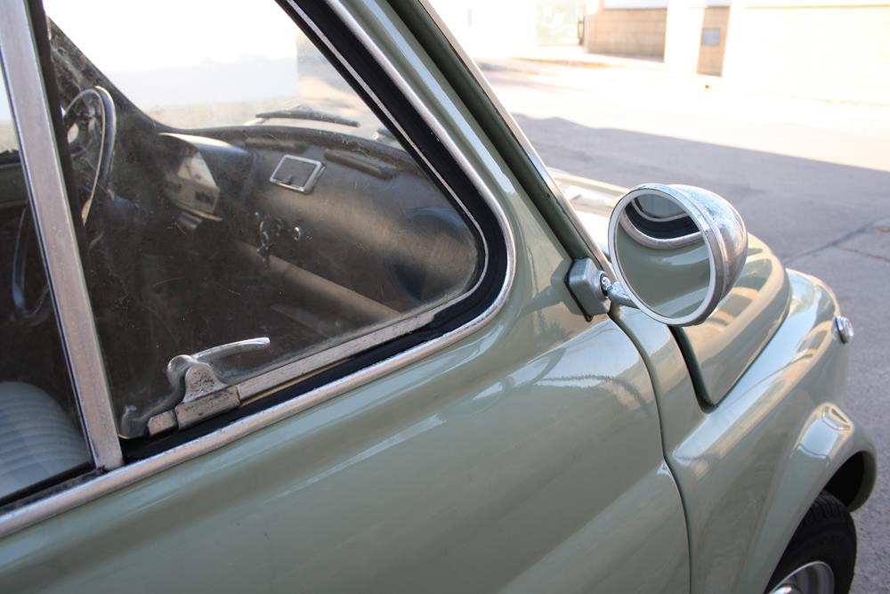 Initially the Fiat 500 was in “Giallo Positano” color with a black interior, but during the restoration the color was changed to this “Verde Aquamarina”. The combination of colors between interior and body is also very apt.